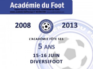 L’Académie fête ses 5 ans à l’occasion de Diversifoot, fête du foot pour tous, samedi 15 et dimanche 16 juin à la prairie St Nicolas, de 10h à 17h.Des tournois seront organisés tout le week-end. Ils sont ouverts à tous et vous pouvez donc venir jouer avec nous.